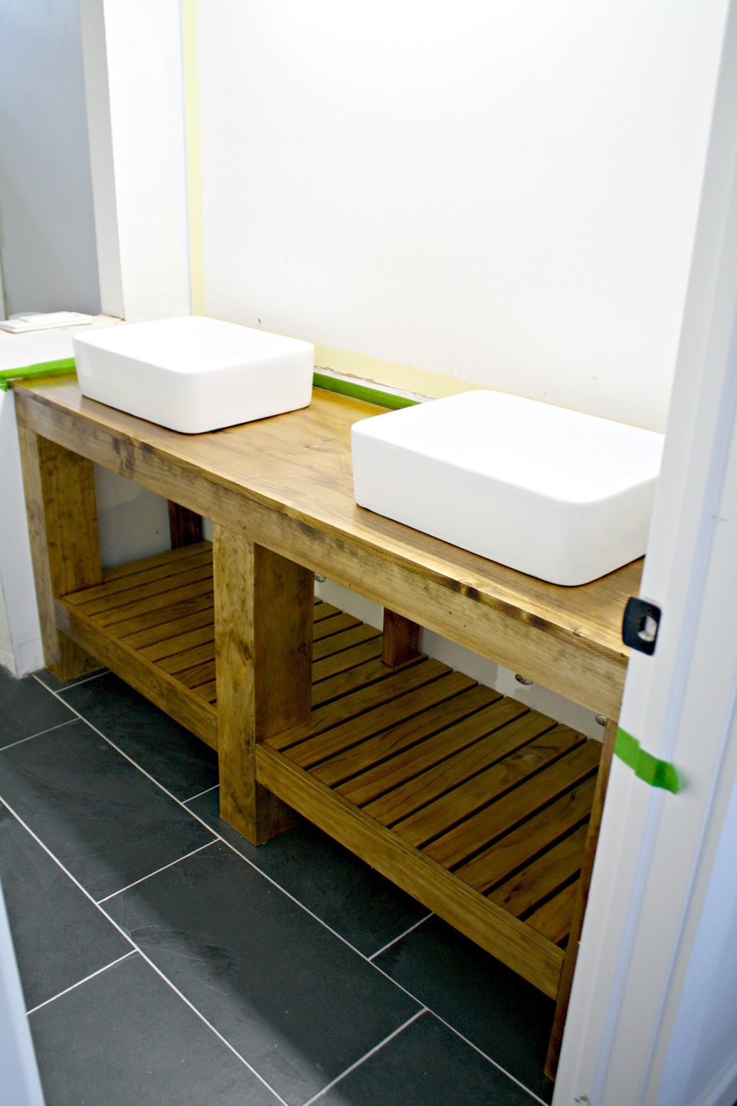 You can see here how the slats now nestle behind the front piece. I love this — it streamlines it a bit more, and as I mentioned, the ends of the slats would have been much darker. When I wrapped the legs I considered painting the vanity white for a hot second. I thought it would look good with white on the bottom and a stained top, and it would! But I’m so glad I went ahead with the stain. It really gives this room some warmth. I love stained wood in contrast with the dark tile and the white accents that will go throughout the room as well. Here’s a before and after of the vanity and a peek at the shower tile that was finished up this morning:
