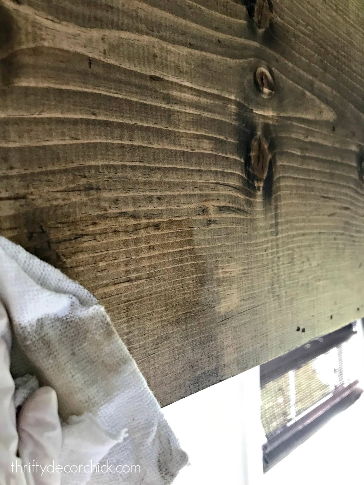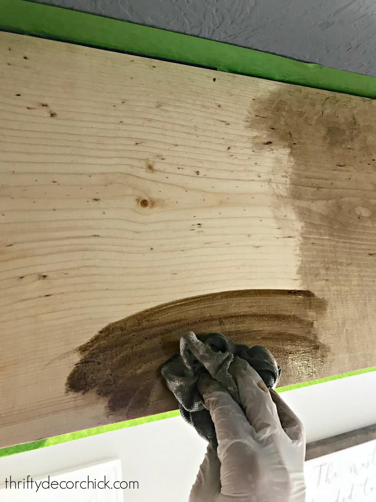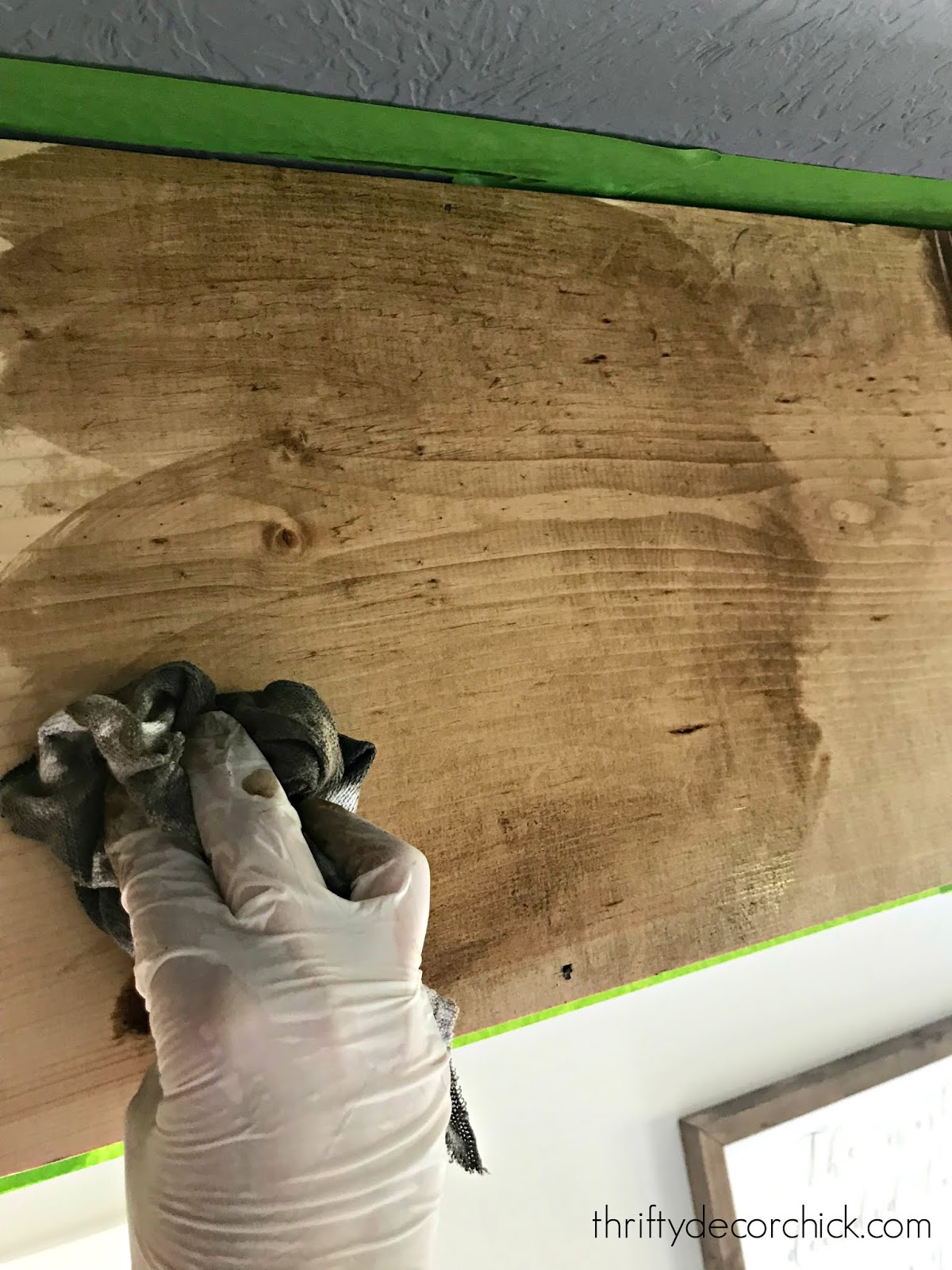 Over the years I’ve found the easiest way to apply stain is with a rag. Gloves are needed! You just use the rag to wipe the stain on, then rub it into the wood: