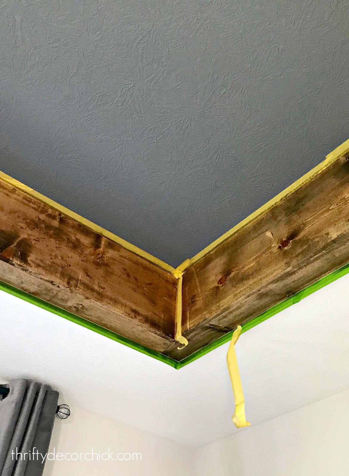 To start, you’ll need something to attach your wood to. The “beams” are only two sides — the bottom and the side. So the piece on the ceiling (be sure to attach to studs) was there to stabilize the side board, and the wood attached to the side of the tray ceiling was there to hold the bottom piece in: